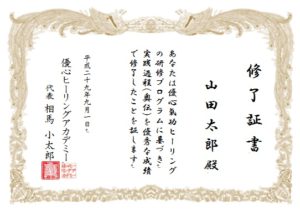 伝授後は自分へ行う事も出来ますし、他者への遠隔セッションや対面施術にもご使用頂けます。伝授セミナー後は「修了証書」として賞状を発行させて頂きます。